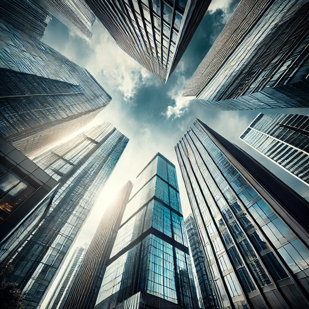 DALL·E 2025-02-21 14.08.25 – A dramatic perspective of office buildings from the ground looking up towards the sky. The buildings are tall and modern, with glass windows reflectin
